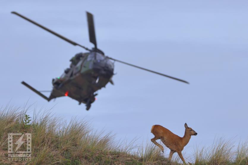 Above: A military helicopter causes a deer to bolt from cover during the exercise Polaris operations. Credit: Flashback Studios