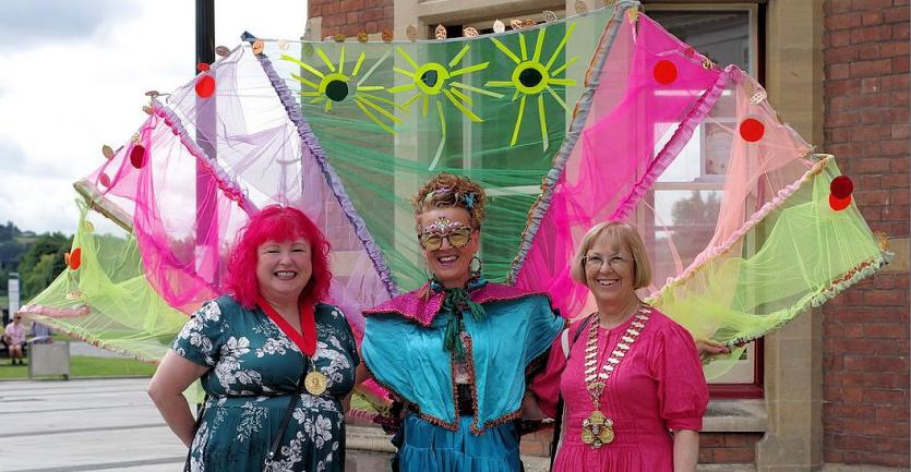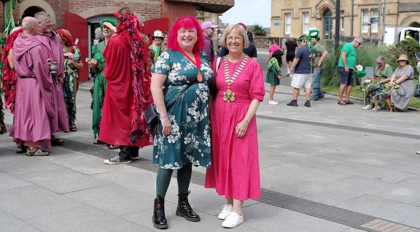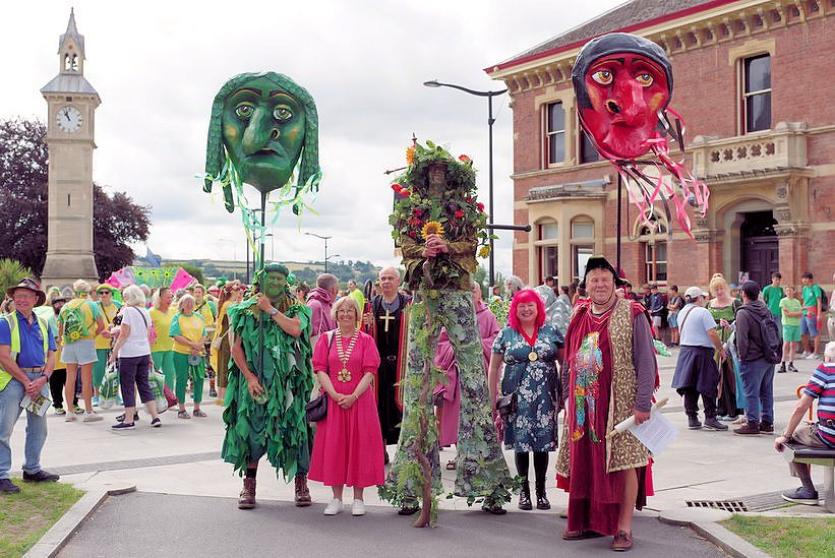 Above: Barnstaple Mayor Janet Coates and consort Gwen Thomas with the Green Man posse. Credit: Simon Ellery