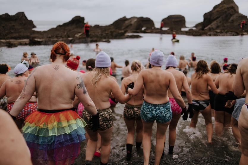 Above: The Topless Swim participants arrive at Tunnels Beaches in Ilfracombe on a rather inclement morning. Credit: Charlotte Turnbull Photography