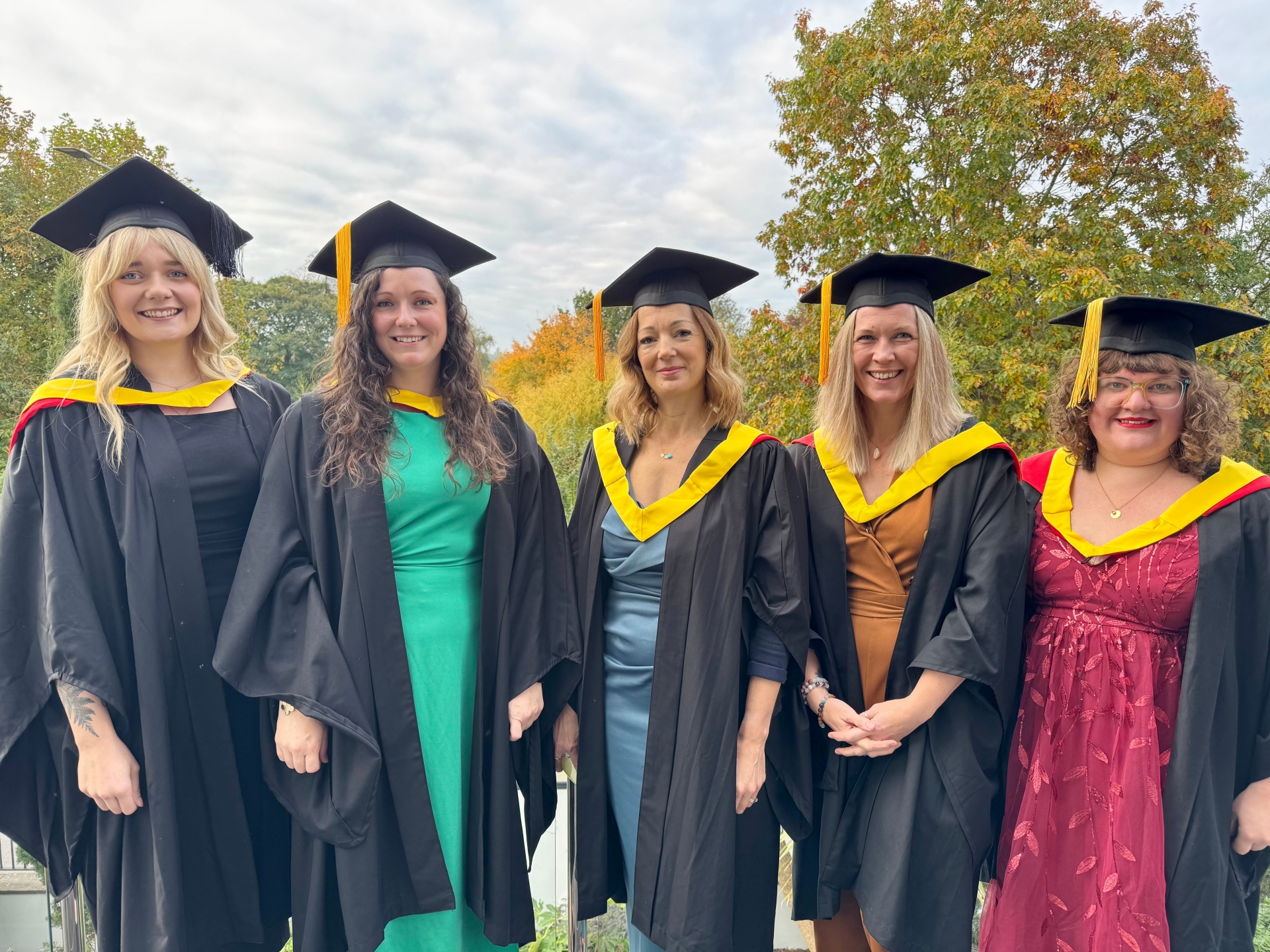 Above: Five of the nursing associate foundation degree graduates on graduation day at the Park Hotel before the ceremony. Credit: Viral PR