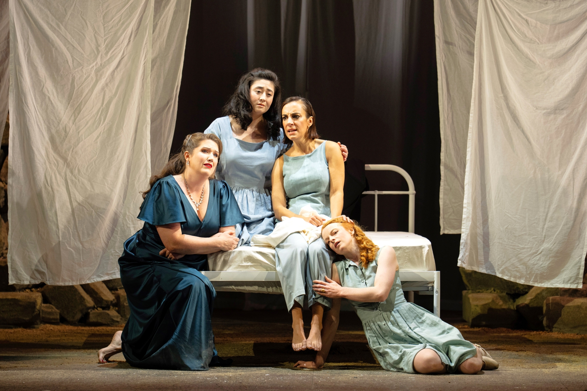 Above:Some of The Rape of Lucretia cast, with Jenny Stafford (female chorus), Jane Monari (Bianca), Clare Presland (Lucretia) and Rosie Lomas (Lucia). Credit: Richard Hubert-Smith