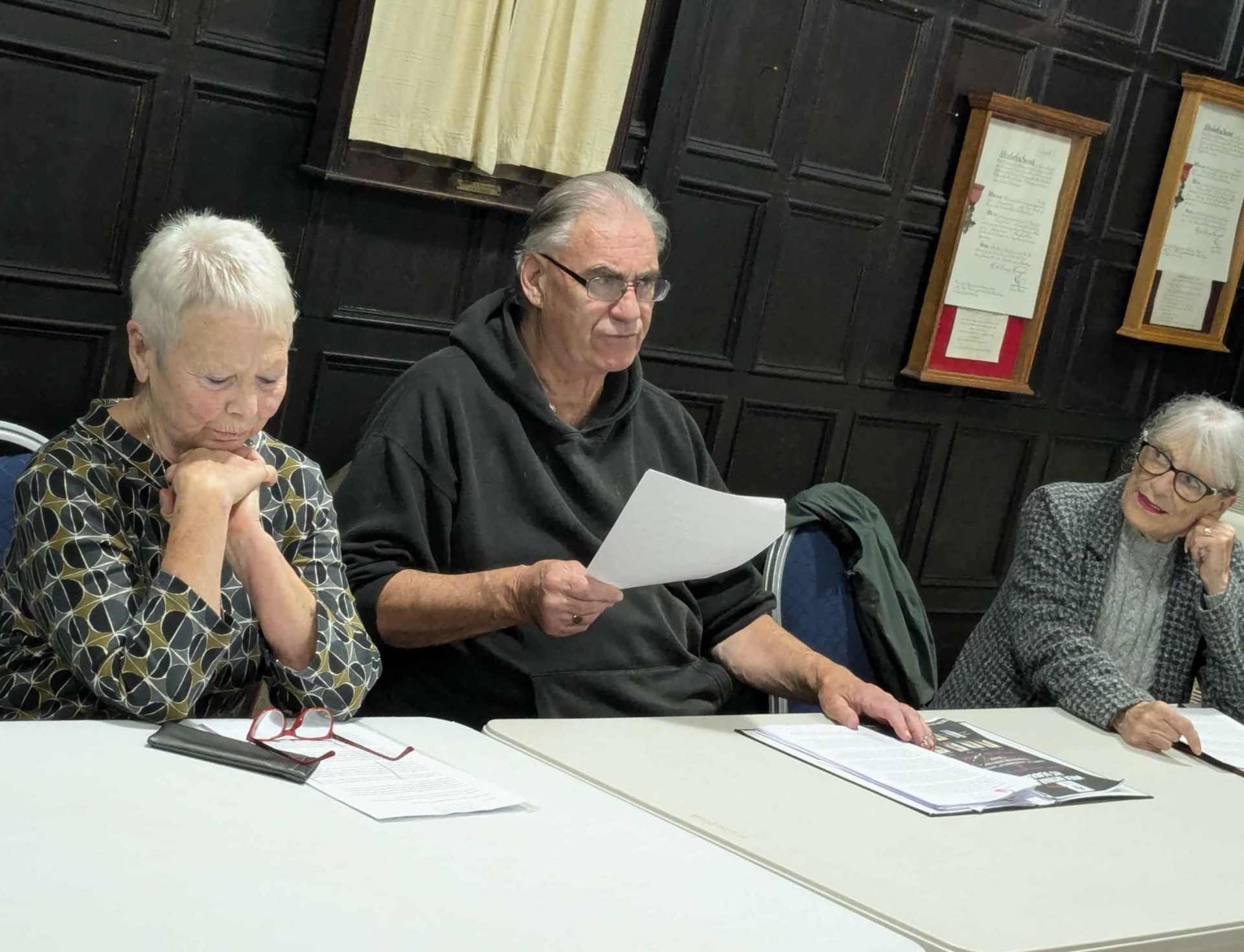 Above: A rehearsal in progress for new Torrington Players interactive murder mystery play When Arthur Met His Deadline. Pictured are Jo Falaize, John Hedge and Val Howes. Credit: Torrington Players