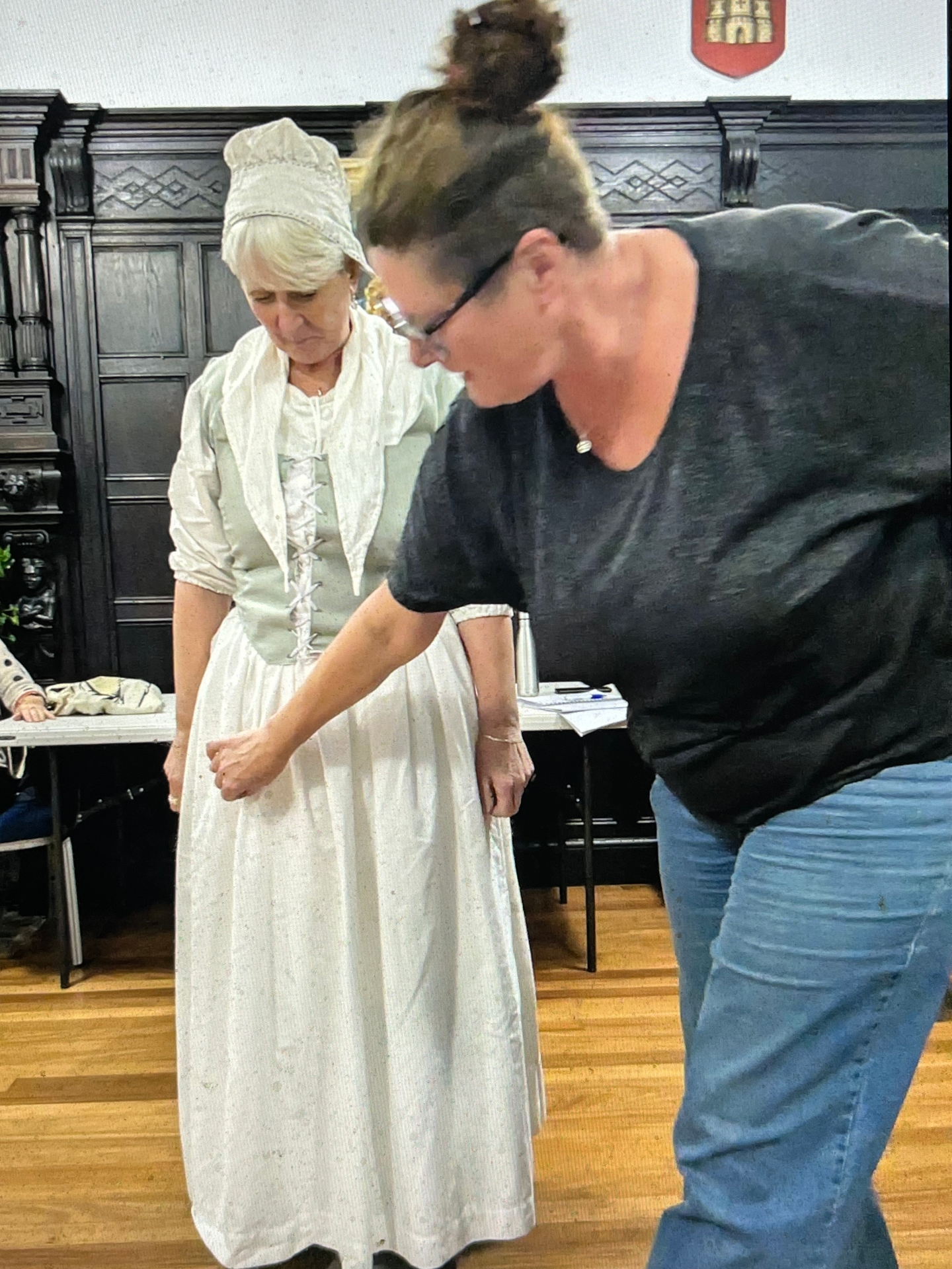 Above: Stage manager Emma Dinnis, also in charge of costume, making adjustments to Jo Corlett's costume, who plays the resident ghost in When Arthur Met His Deadline. Credit: Torrington Players