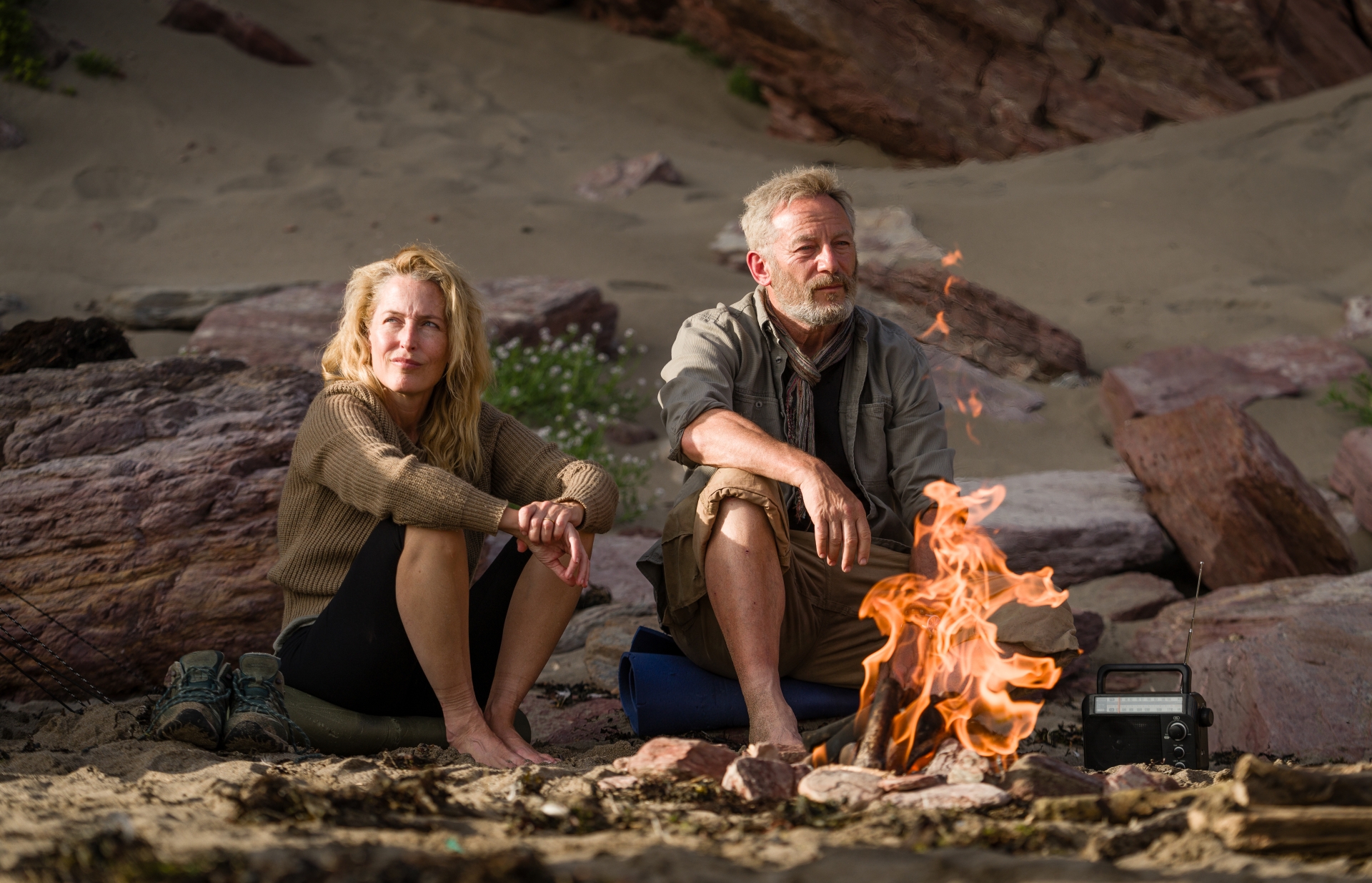 Above: Gillian Anderson and Jason Isaacs as Raynor and Moth Winn in The Salt Path. Credit: Steve Tanner/Black Bear