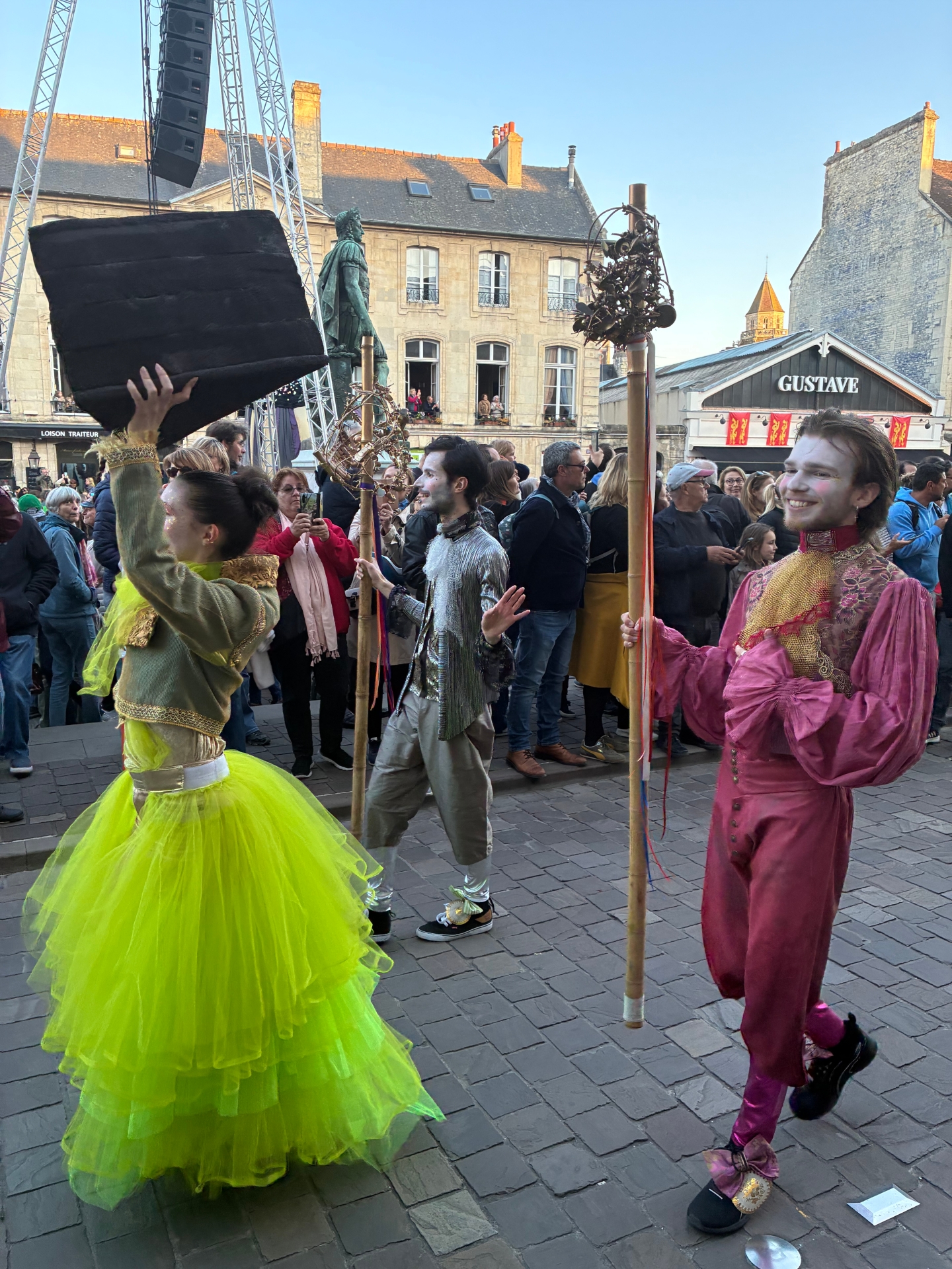 Their first day in France ended with street celebrations and parades in Caen to mark the city’s 1,000th birthday – featuring giants, dancing, music and fireworks.