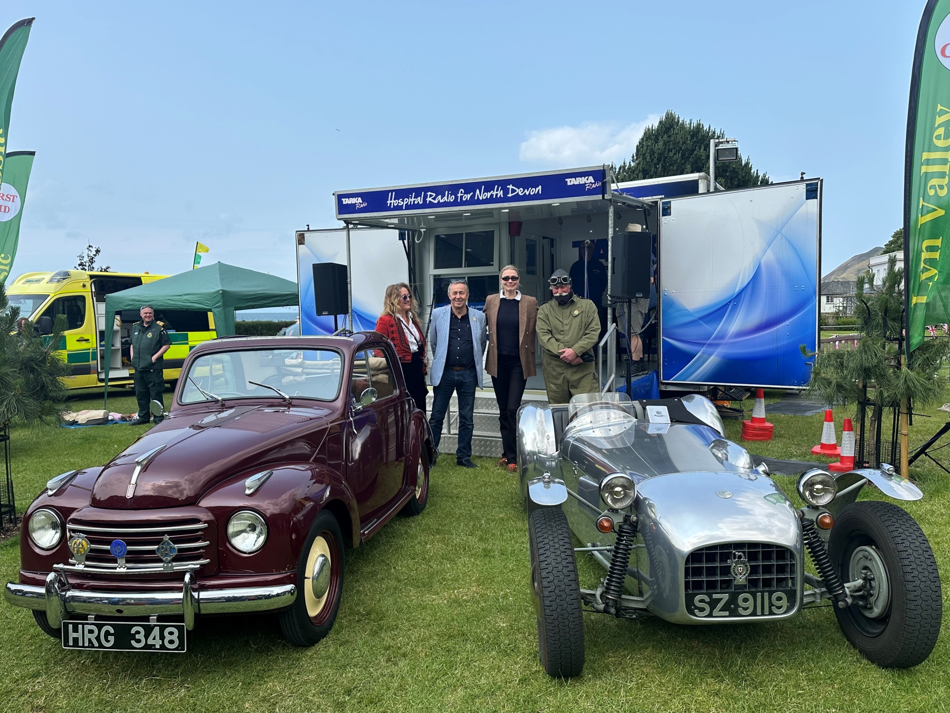 Above: Alice Temperley MBE, John Tribe, Jodie Kidd and Kevin Sargeant with their chosen cars of the Lyn Valley Classic – John’s Fiat (left) and Kevin’s Lotus. Credit: James Tucker