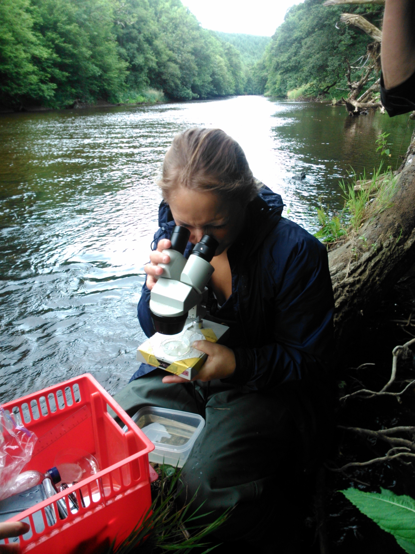 Above: Izzy Moser from Devon Wildlife Trust, using a microscope to check river life. Credit: Clinton Devon Estates