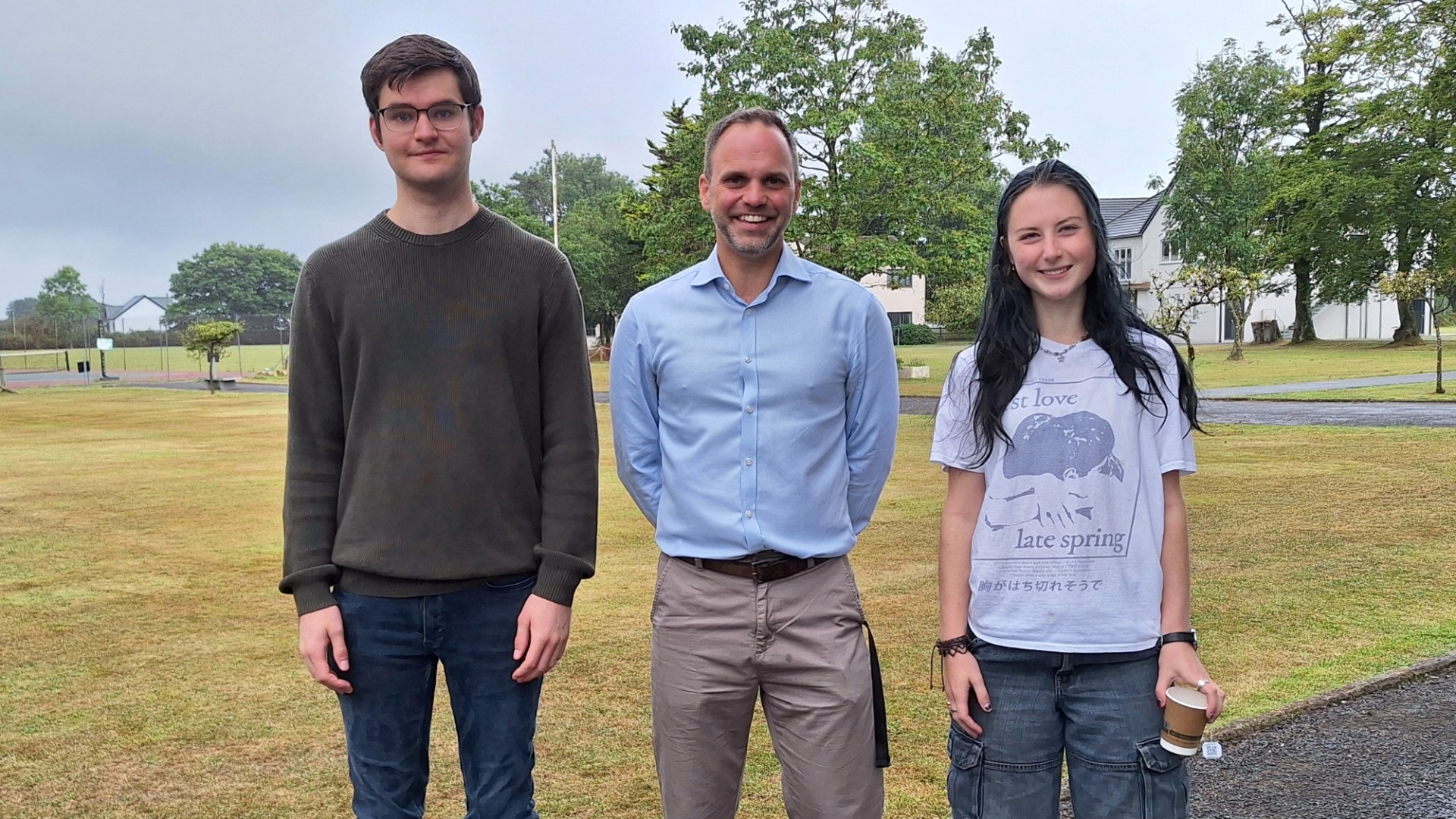 Above: Shebbear College head Charlie Jenkins with Sebastian Crookes and Alice Hunkin, who both achieved four A* grades in their A Levels. Credit: Shebbear College