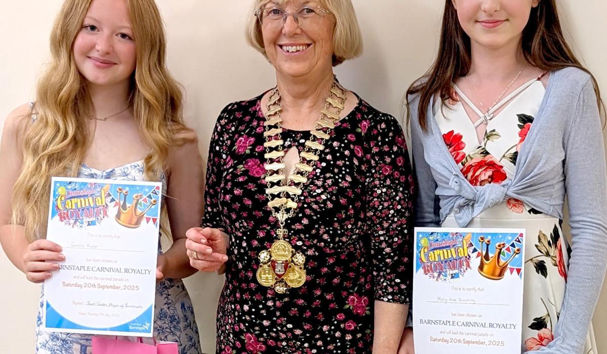 Barnstaple’s two carnival queens for 2025, Gracie Roper (left) and Mollie-Rose Browning (right) with Barnstaple Mayor, Councillor Janet Coates.