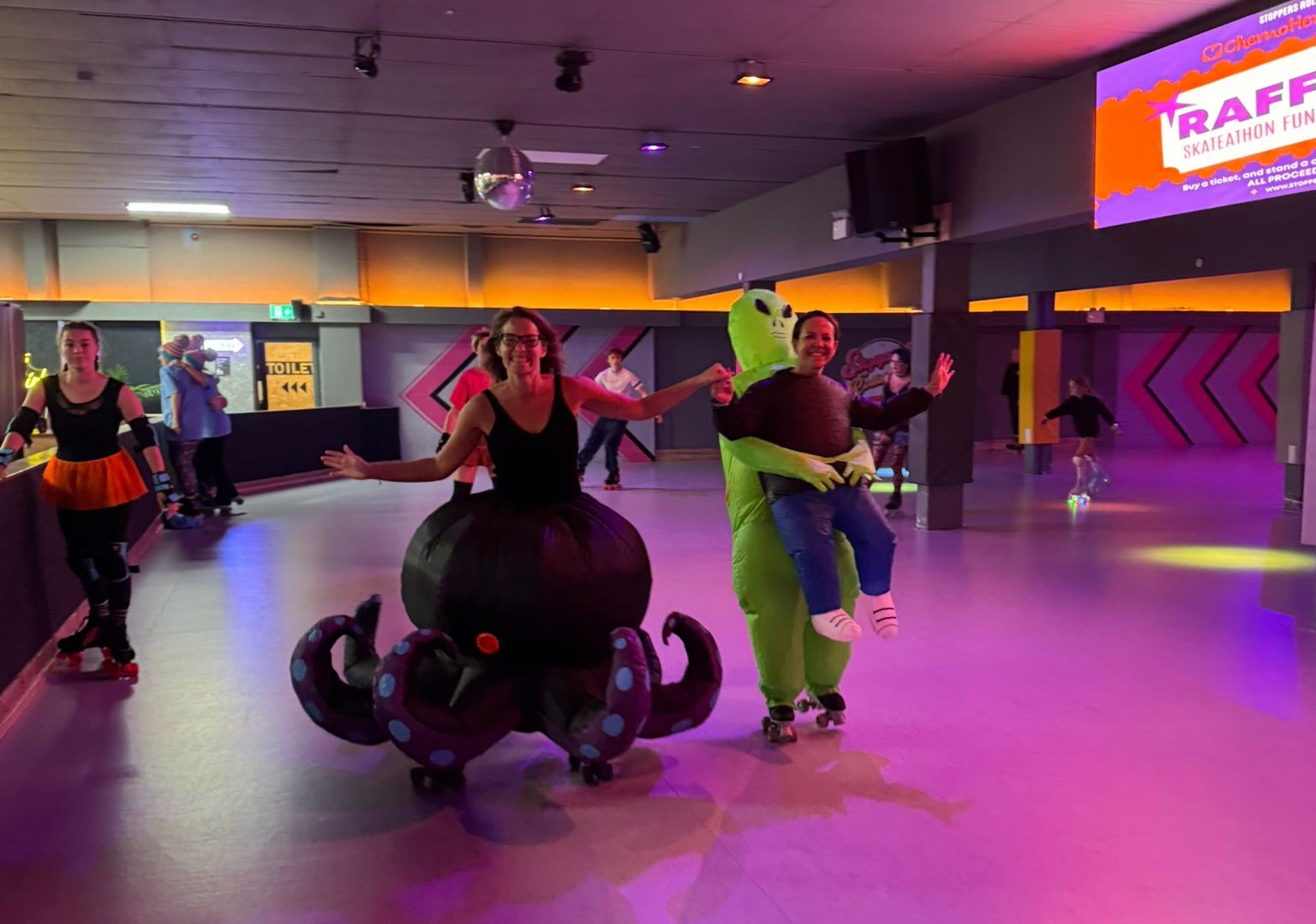 Above: Skate fans donned crazy costumes to take part in the endurance marathon. Credit: Royal Devon Hospitals Charity