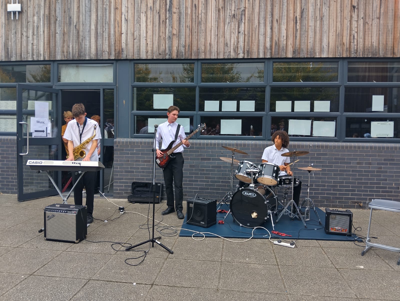Bideford College students enjoyed time outside while the school band performed on World Mental Health Day. Credit: Bideford College