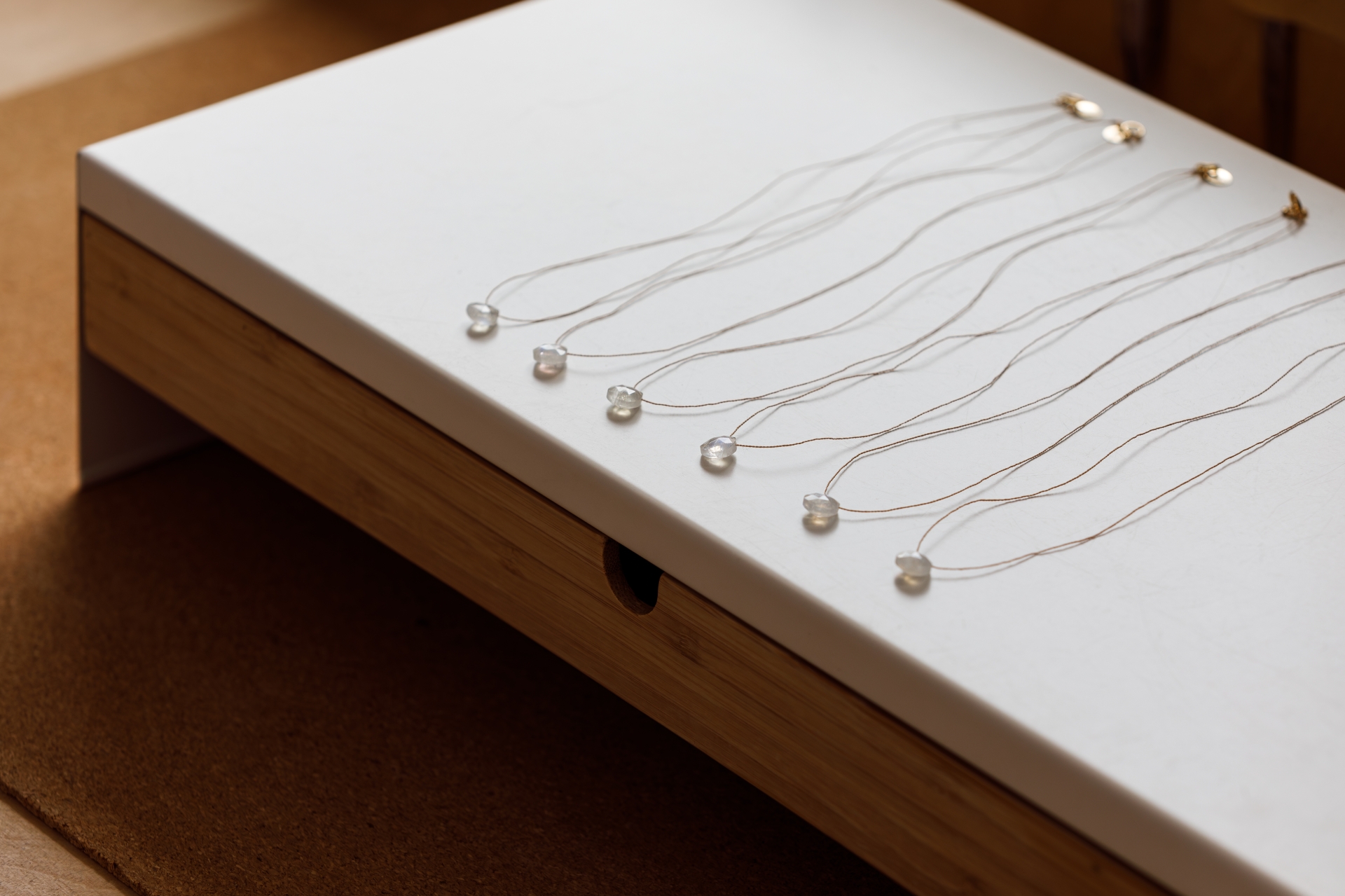 Above: Bestselling Moonstone fine cord necklaces on the makers bench inside the Wanderlust Life shop and studio.