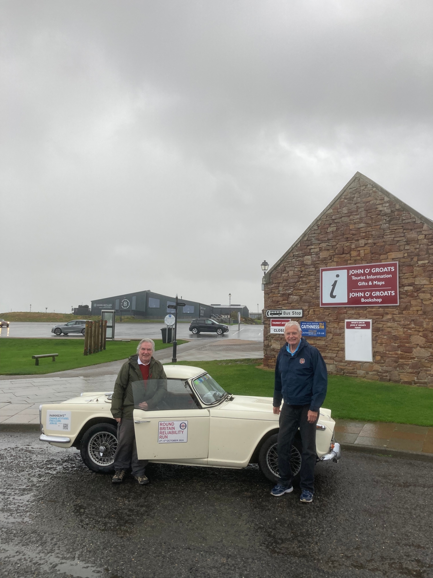 Above: Tim, Mike and the TR4A at a very windy John o’ Groats. Credit: Tim Hunt