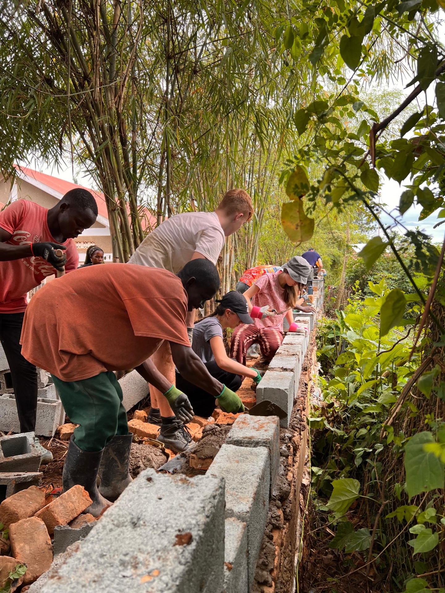 Above: The students from Barnstaple working with Ugandan bricklaying trainees at Kira Farm. Credit: Amigos