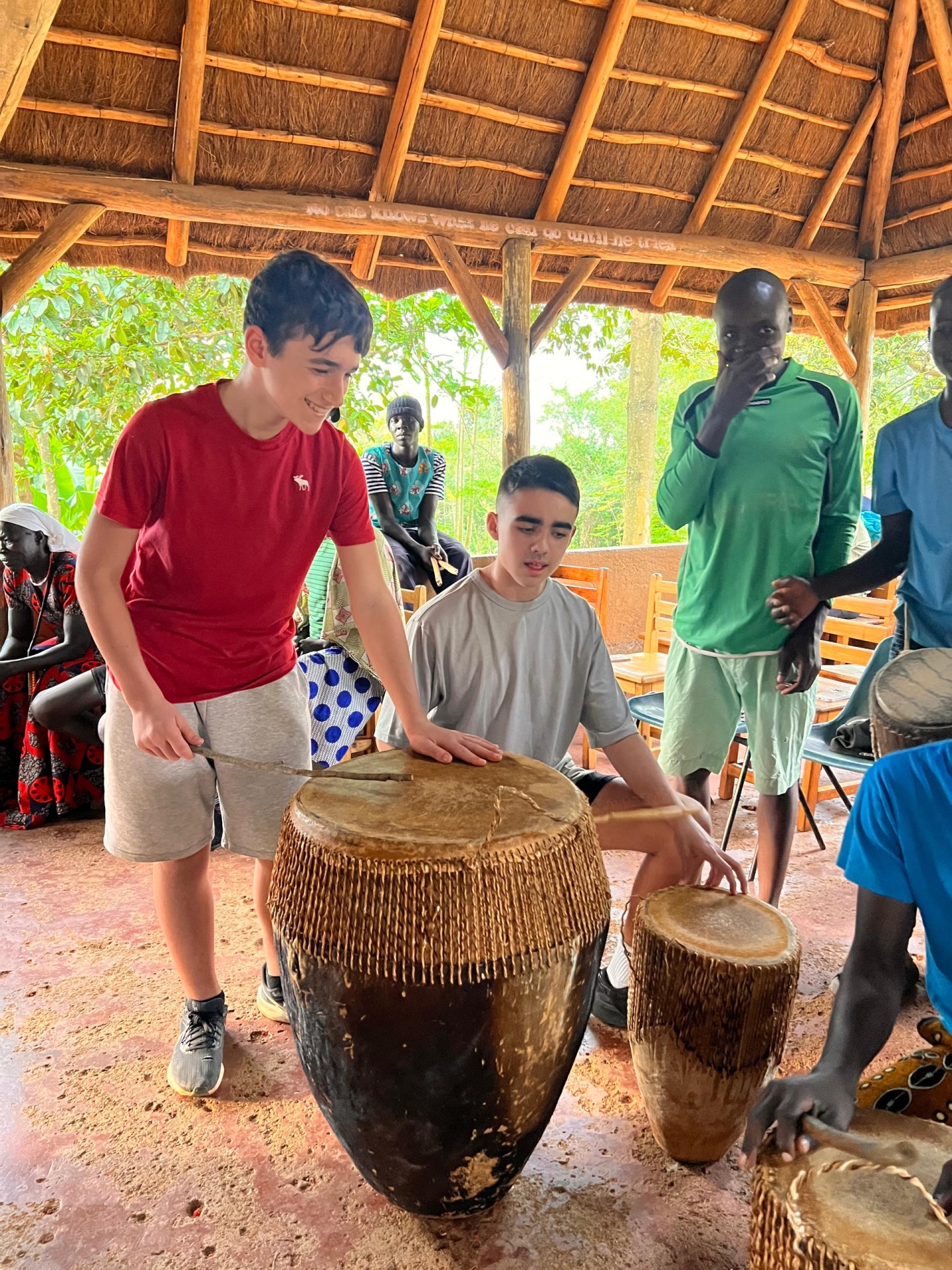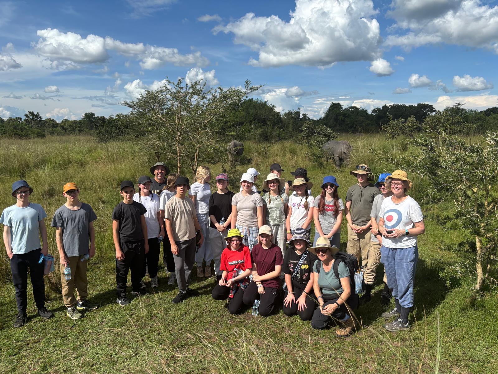 Above: Students from Park try their hand at traditional Ugandan drumming and (below) the group also enjoyed a trek to see rhinos in Uganda. Credit: Amigos