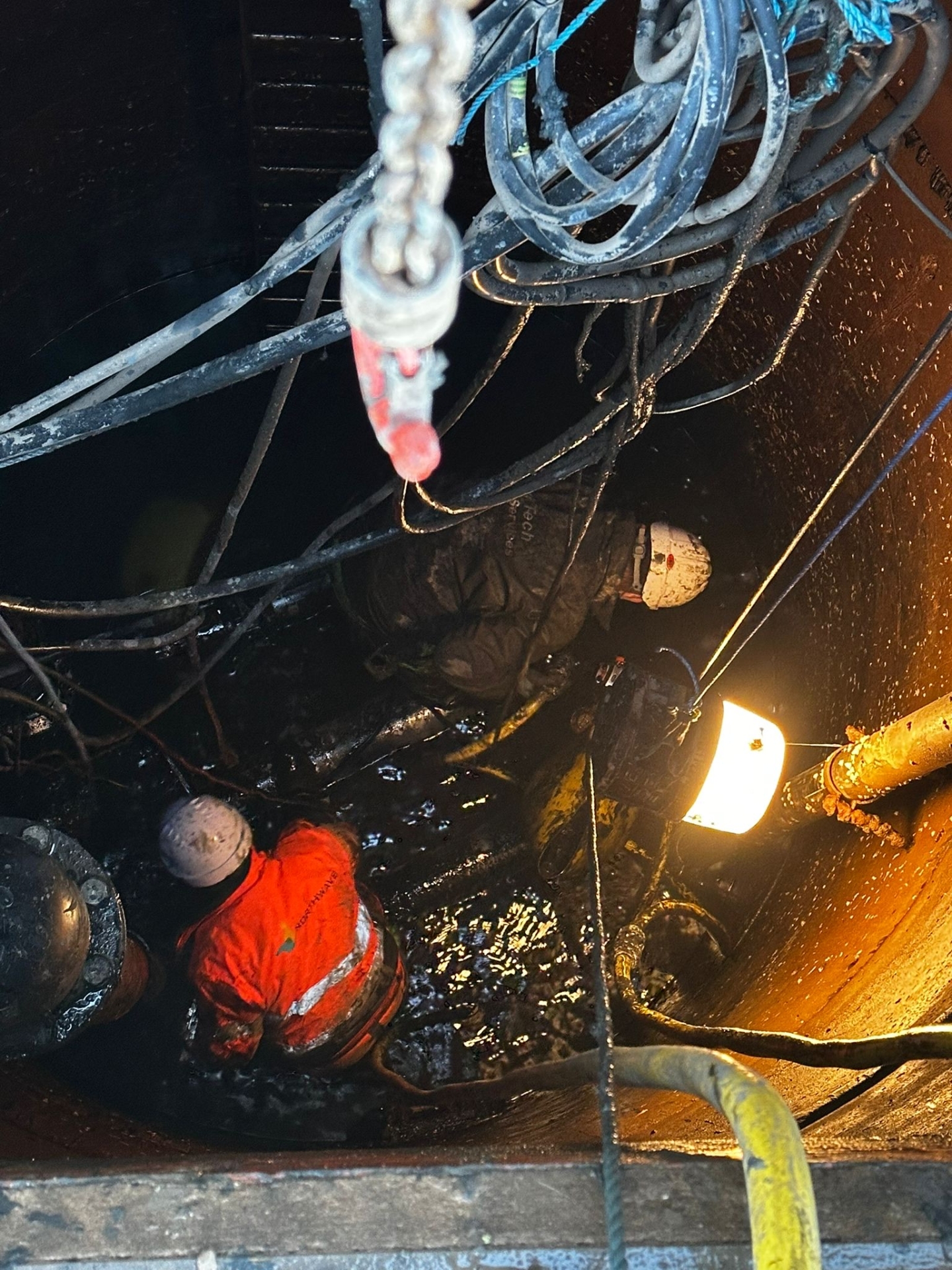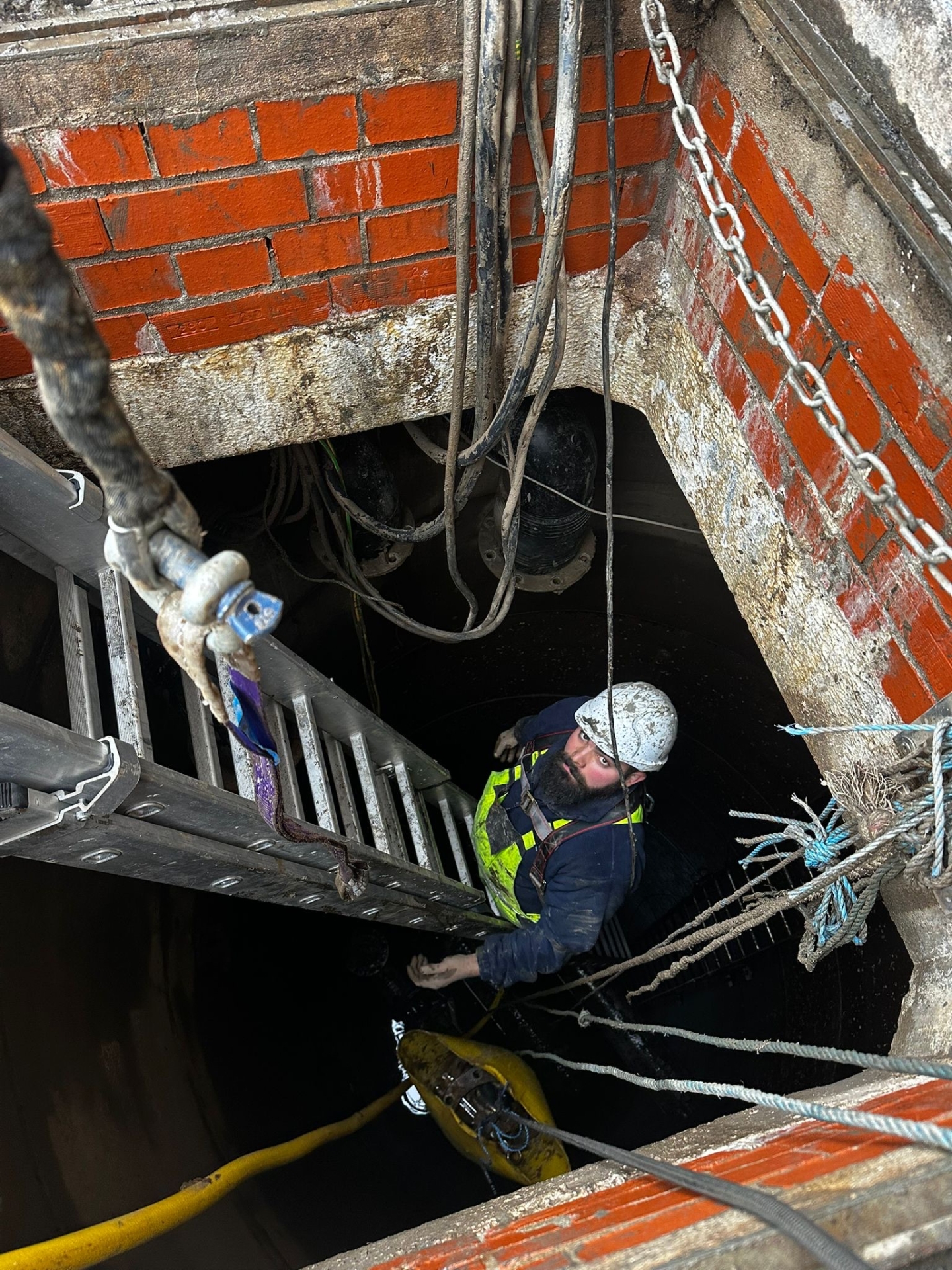 Above: A member of the specialised workforce prepares to descend into the depths and (below) the main pumps from the fountain are stripped out and ready to be refurbished. Credit: TDC
