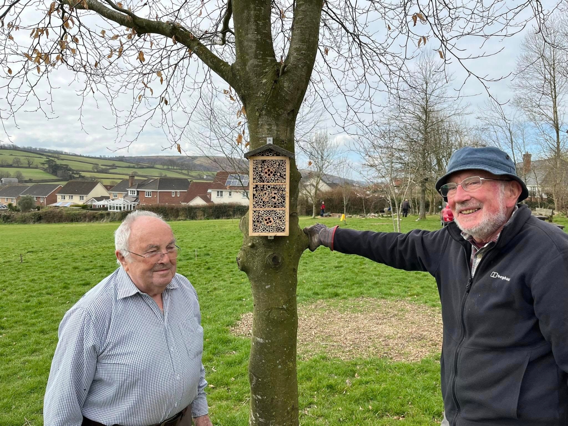 Above: Local craftsman Russell Maynard (left) and Michael Gee with one of the bug hotels installed to mark the 25th anniversary. Credit: Landkey Millennium Green trustees