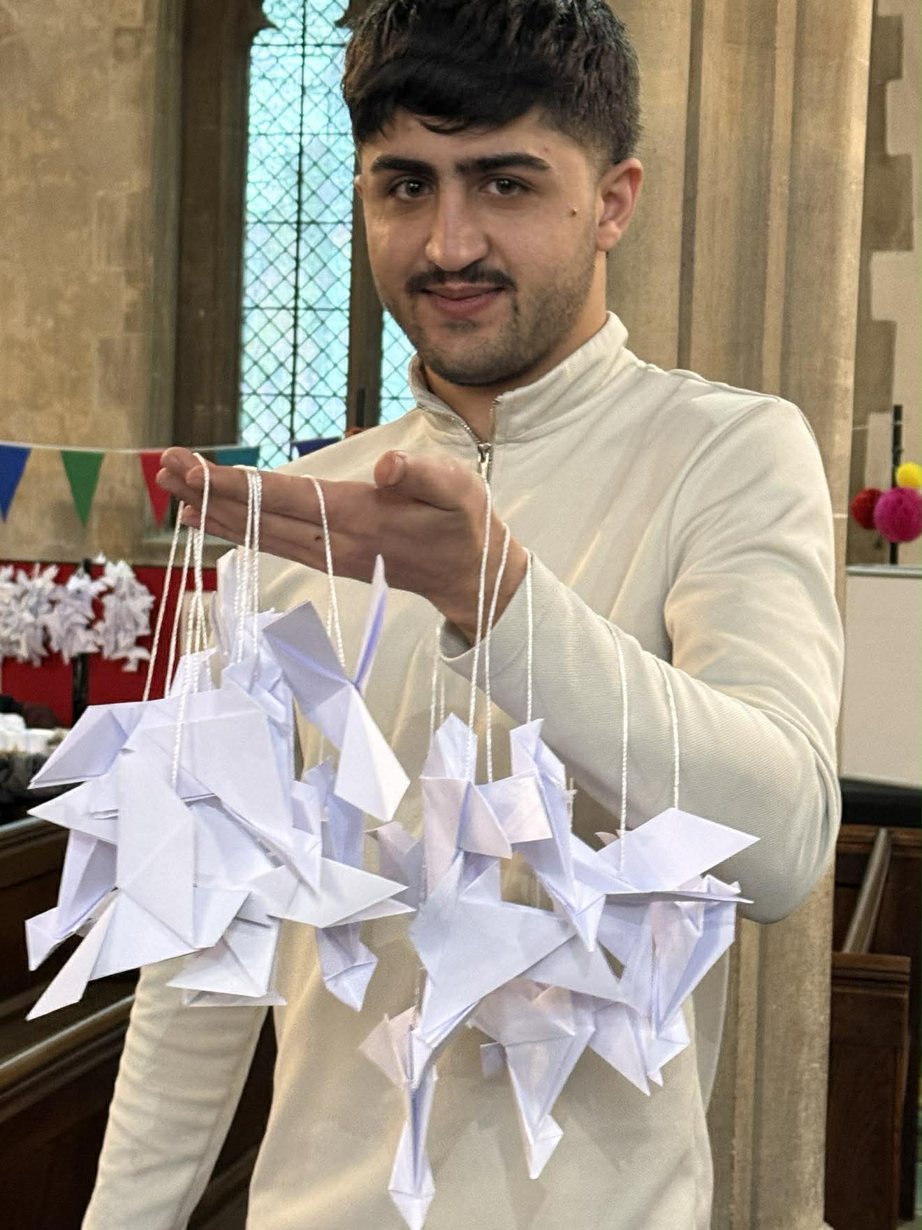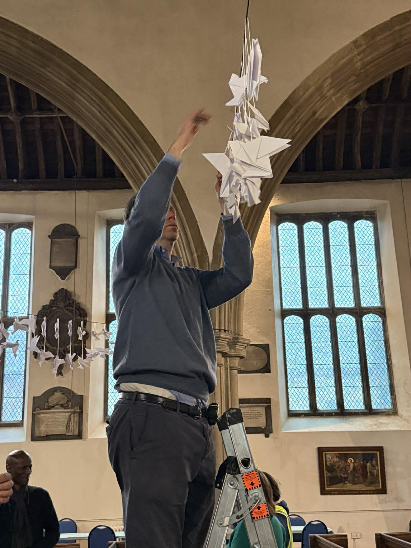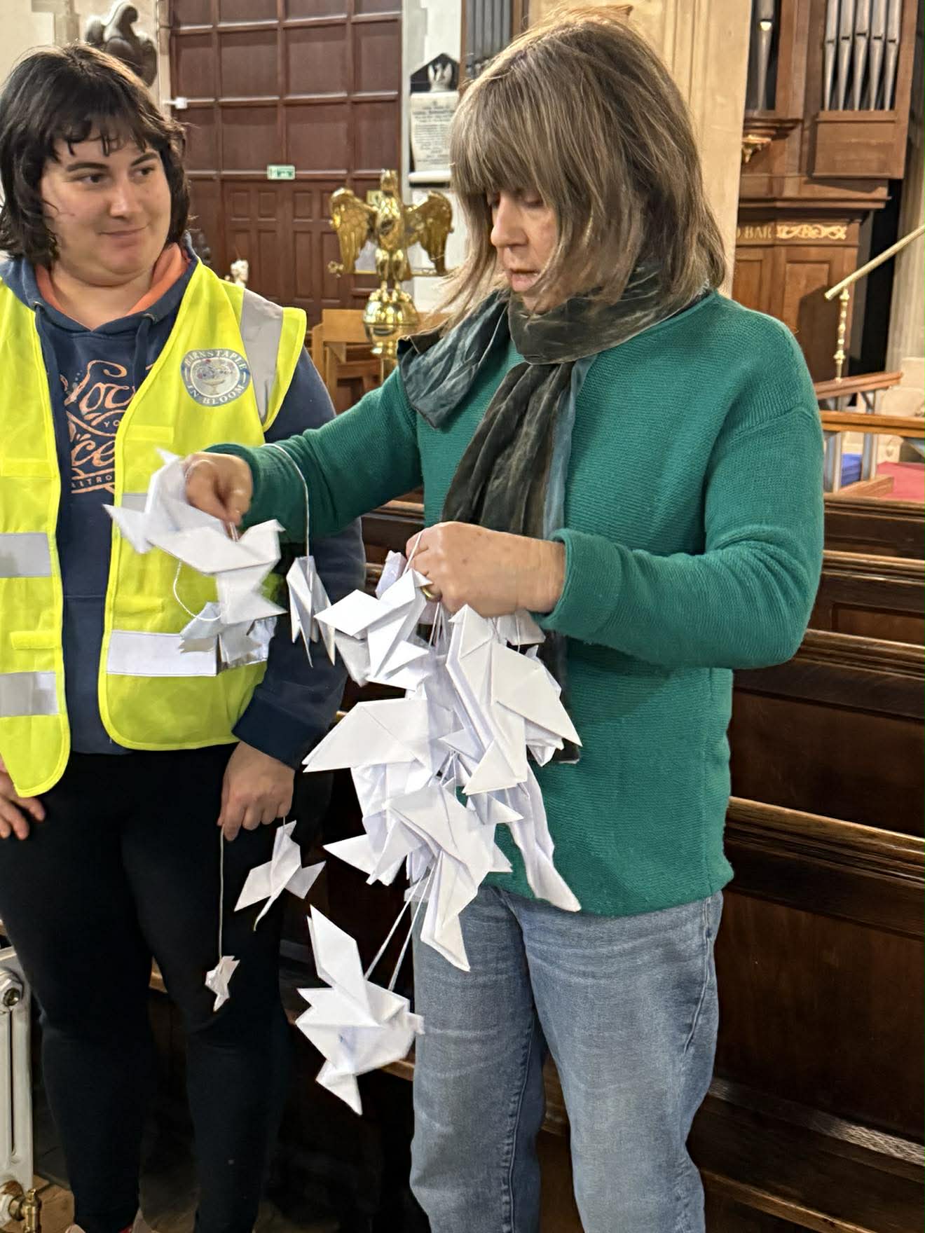 Above and below: Volunteers have been busy putting up the origami doves of peace at the church.