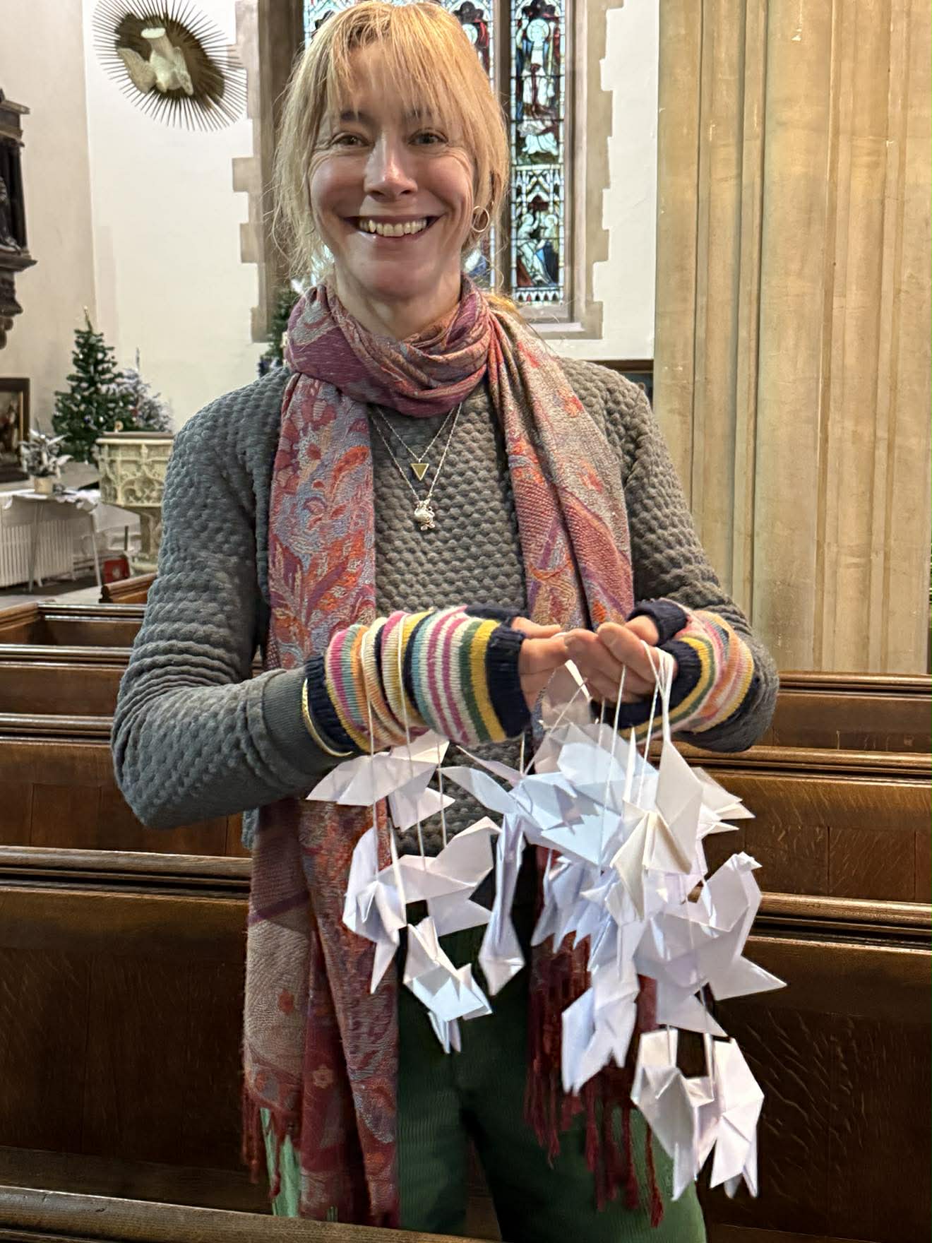 Above: Artist Caroline Preston with some of the origami doves to be installed at Barnstaple’s Parish Church.