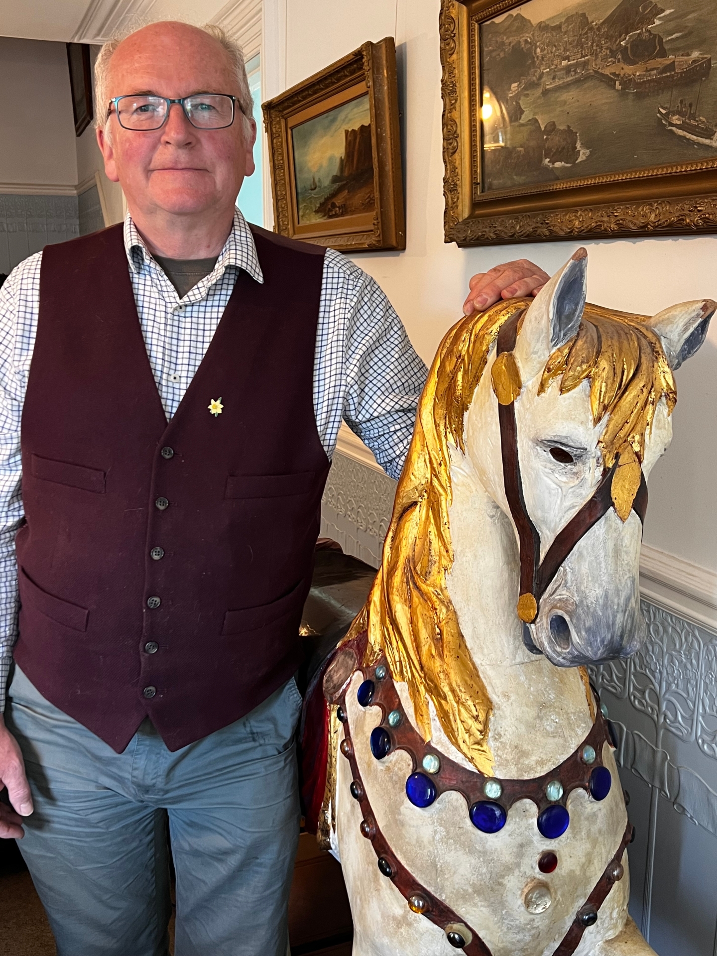 Above: Hele Cornmill owner David Jones with his handcrafted fairground carousel horse, which will be one of the centrepieces at the mill’s Ilfracombe Art Trail exhibition. Credit: Hele Cornmill