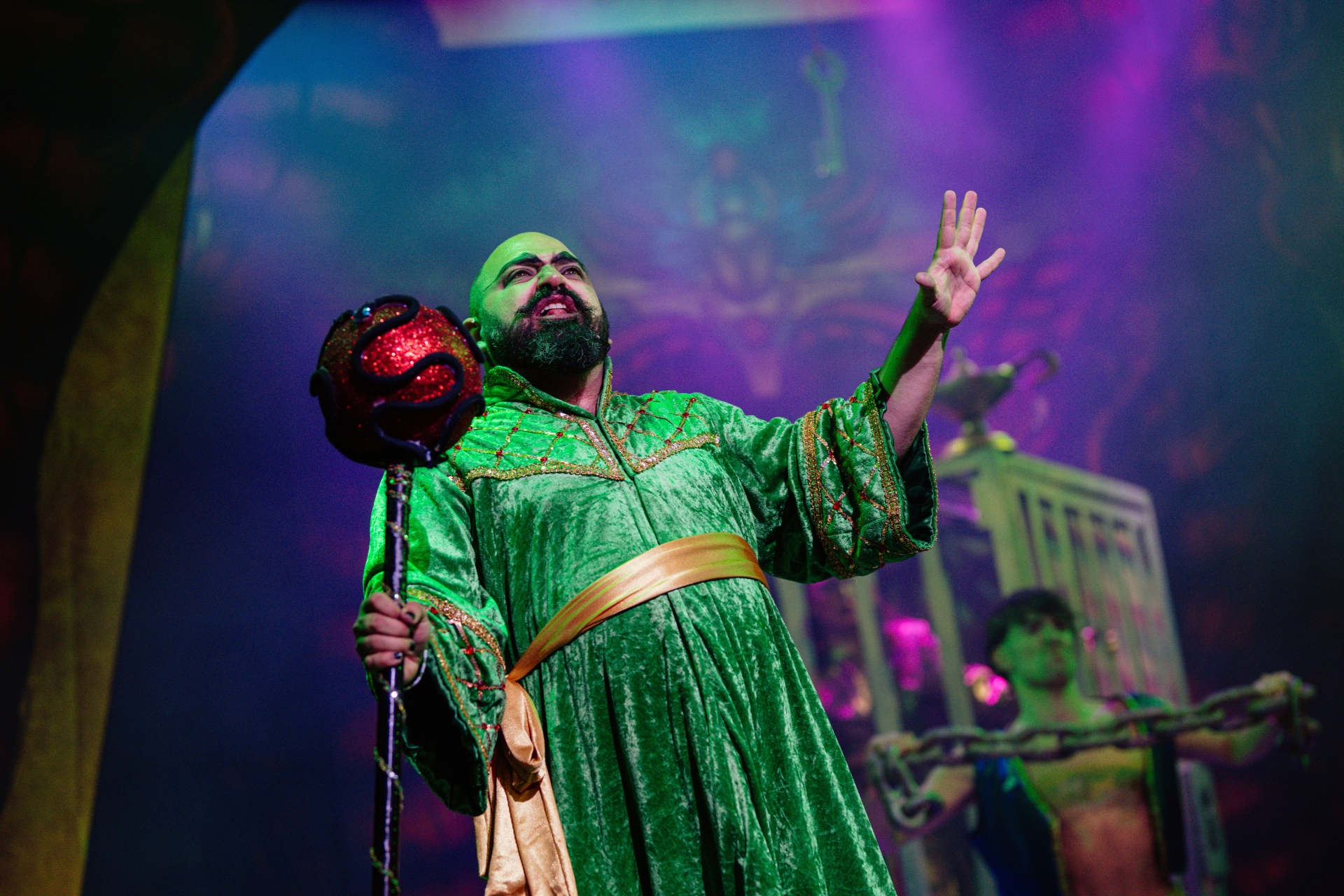 Above: Ralph Bogard plays Abanazar in the Queen’s Theatre production of Aladdin. Credit: Dom Moore Photography